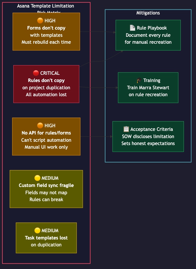 Key finding: The SOW is deliverable and commercially defensible, but has one significant technical blind spot (Asana template limitations) and would benefit from stronger scope boundaries. This is a contained, in-and-out engagement — not a multi-phase transformation arc.